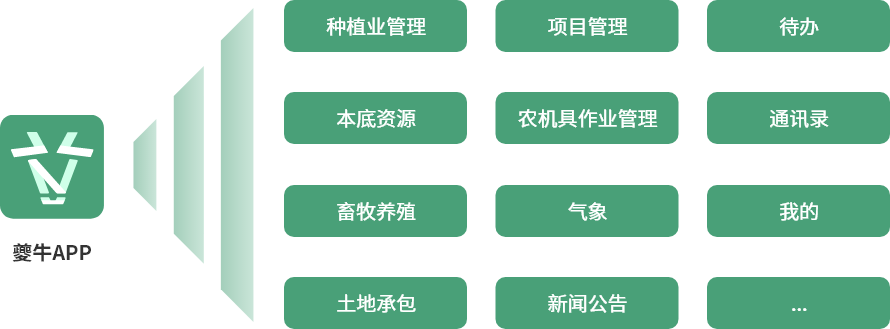 夔牛APP主要包括首页、待办、农情、通讯录、我的等5大导航菜单。其中,首页模块包含当天及次日天气预报、信息系统、待办消息、新闻公告等功能,信息系统版块整合了种植业管理、本底资源、畜牧养殖、土地承包、项目管理、视频监控、农机具管理等子应用;待办模块包含了会议议程、投票管理、问卷调查等功能;气象模块包含灾害信息、一周天气预报、气象地图等功能;通讯录模块实现内部通讯录功能;我的模块包含用户信息,会议议程、投票管理、问卷调查等功能的快捷入口,意见反馈、二维码、当前版本、修改密码、退出登录等功能。